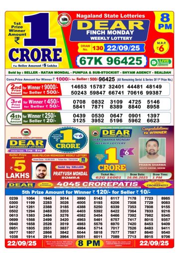 Dear Lottery 1PM Result Today 22/09/2025