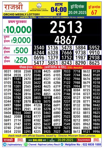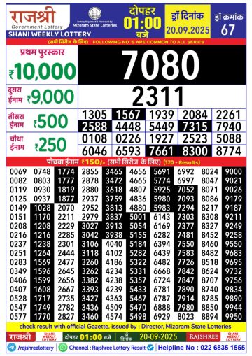 Rajshree Lottery 1PM Result Today 20/09/2025
