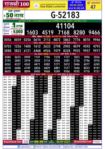 Rajshree 100 Evening 6:30PM Lottery Result 04/09/2025