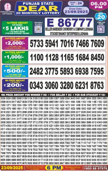 Punjab State Dear 20 Monthly Lottery 6PM Result 23/09/2025