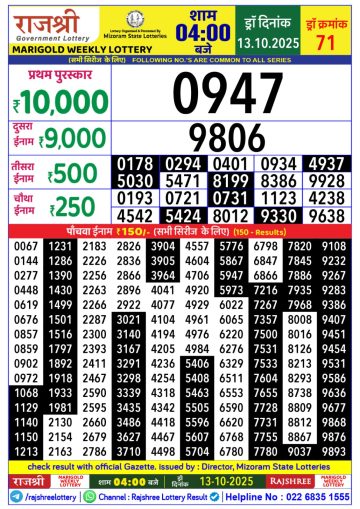 Rajshree Lottery 1PM Result Today 13/10/2025