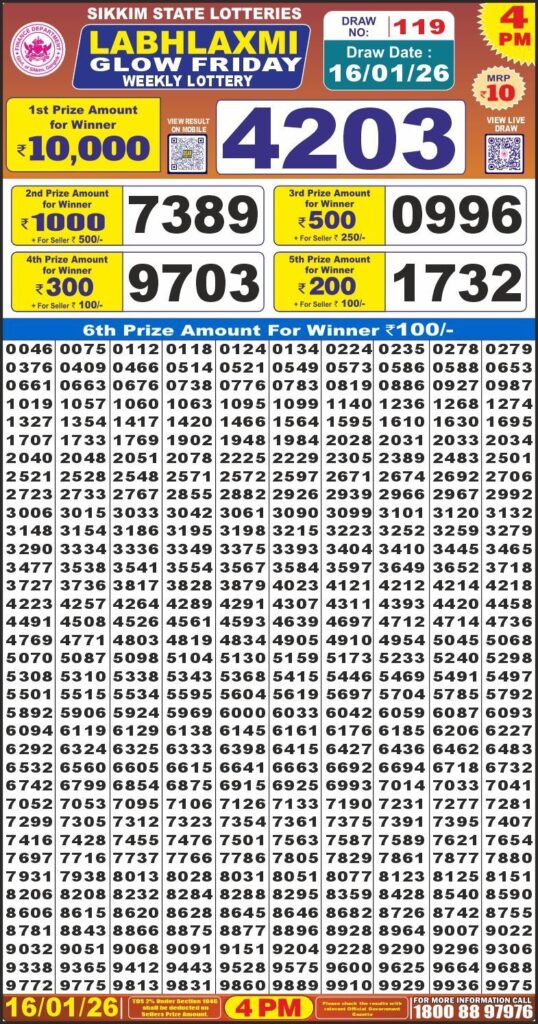 Labh Laxmi Glow Friday lottery result 4pm 16-01-2026