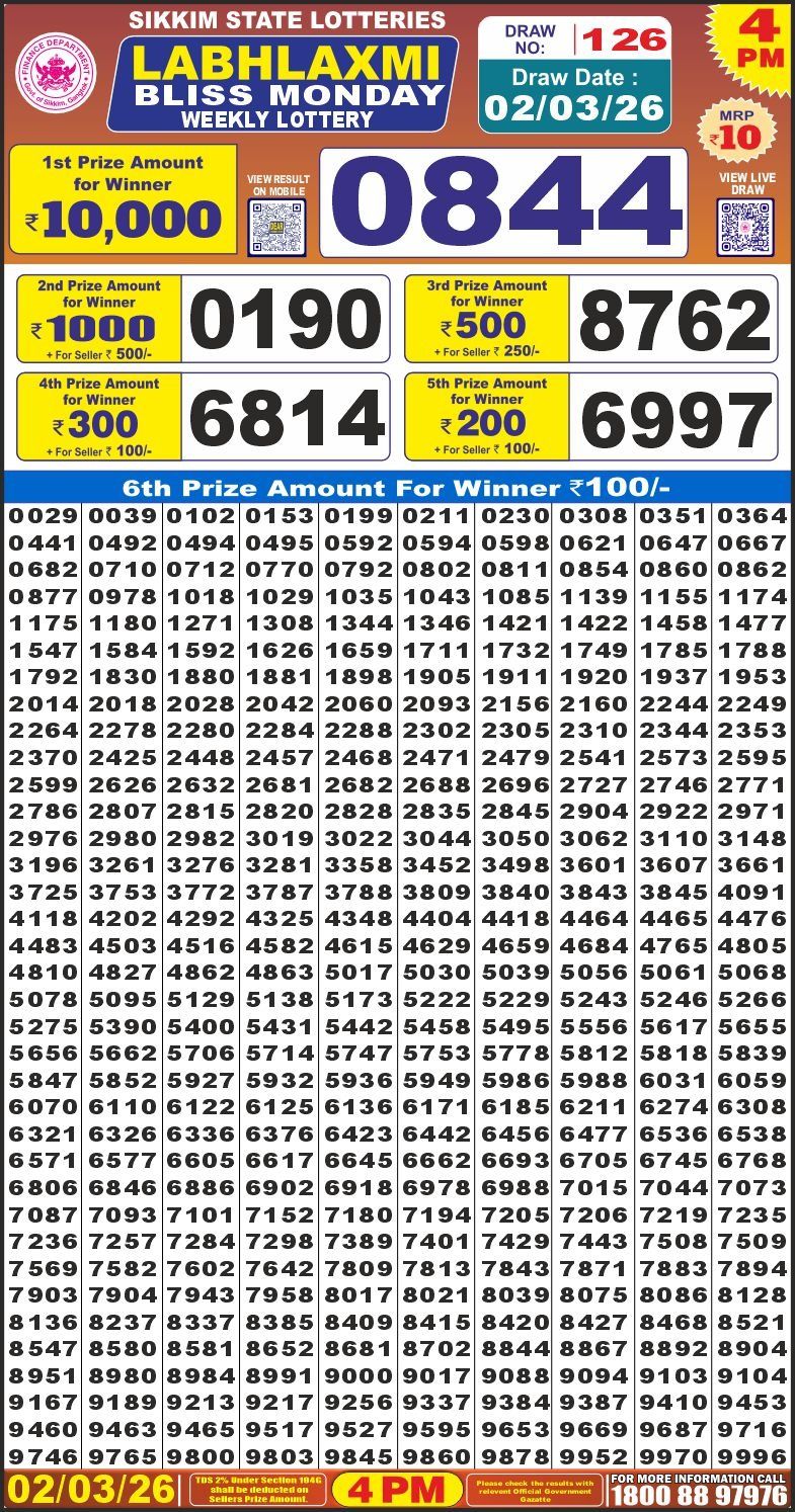 Labh Laxmi Bliss Monday lottery result 4pm 02-03-2026