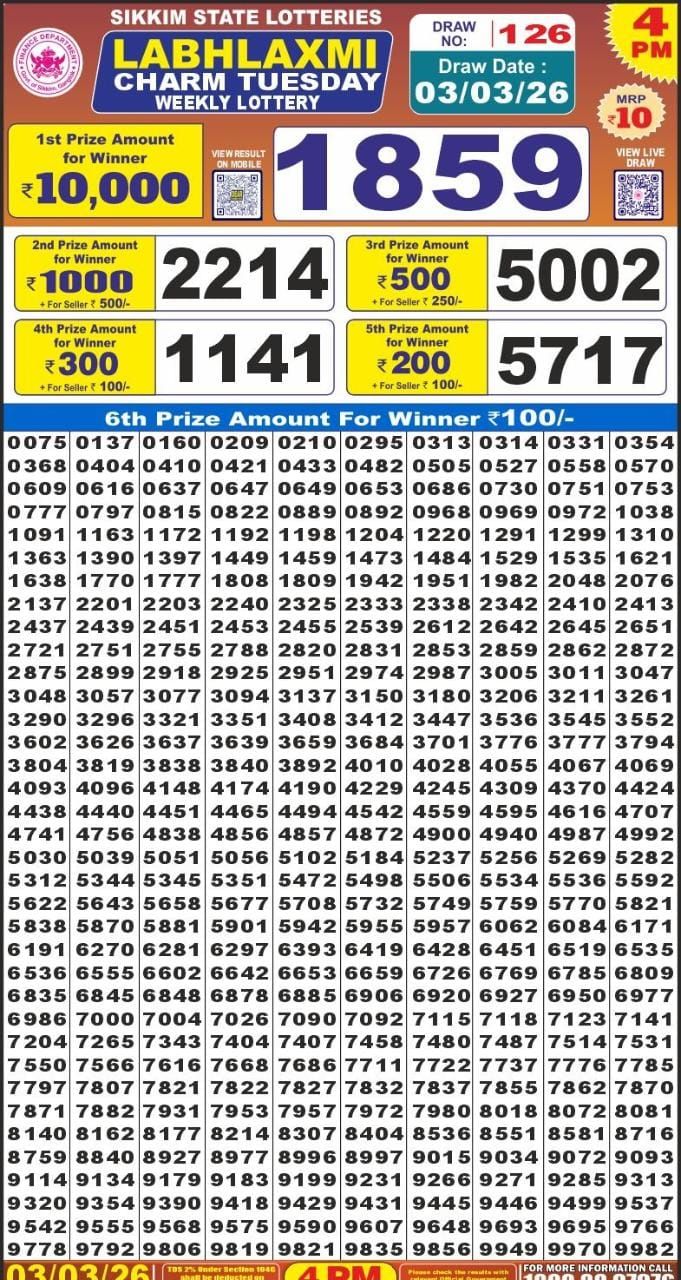 RAJSHREE NIGHT MANGAL Weekly Lottery Result 03-03-2026RAJSHREE 50 MANGAL Weekly Lottery Result 03-03-2026RAJSHREE TUESDAY Weekly Lottery Result 03-03-2026Dear Destiny Weekly Lottery Result 8:00 PM 03-03-2026Golden Star 7PM Result 03-03-2026Dear Prestige Weekly Lottery Result 6:00 PM 03-03-2026RAJSHREE 10 EVENING MANGAL Weekly Lottery Result 03-03-2026Punjab State Dear Bronco Weekly Lottery Result 5:00 PM 03-03-2026Labh Laxmi Charm Tuesday lottery result 4pm 03-03-2026RAJSHREE TULIP Weekly Lottery Result 03-03-2026Kerala Lottery Sthree Sakthi Result 3PM 03-03-2026RAJSHREE MANGAL Weekly Lottery Result 03-03-2026Dear Shine Weekly Lottery Result 1:00 PM 03-03-2026