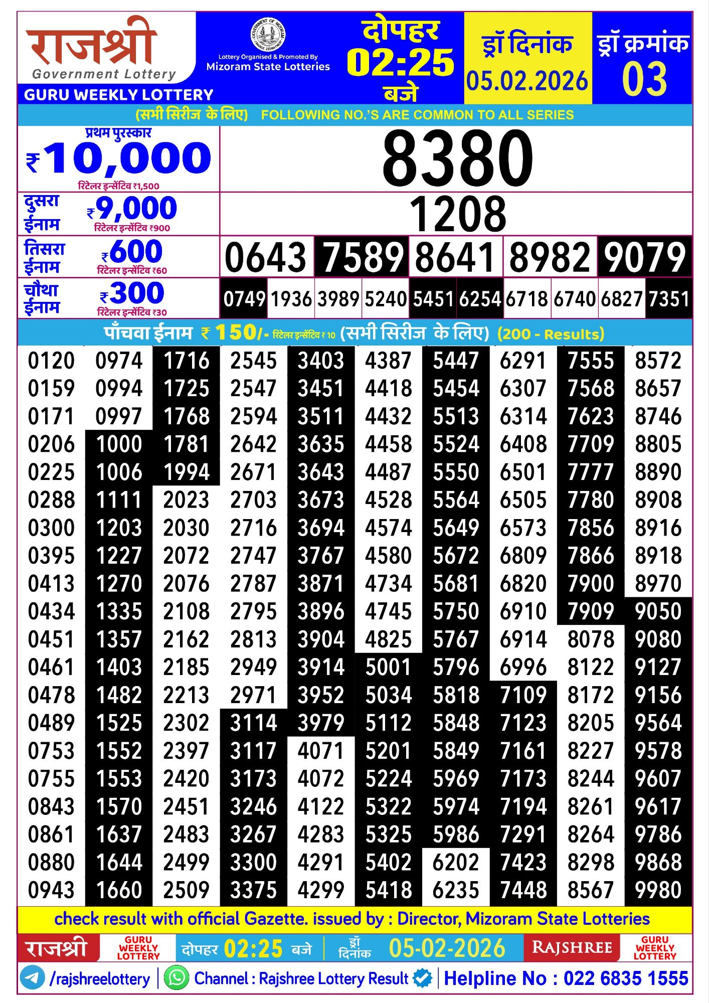 RAJSHREE GURU Weekly Lottery Result 05-02-2026