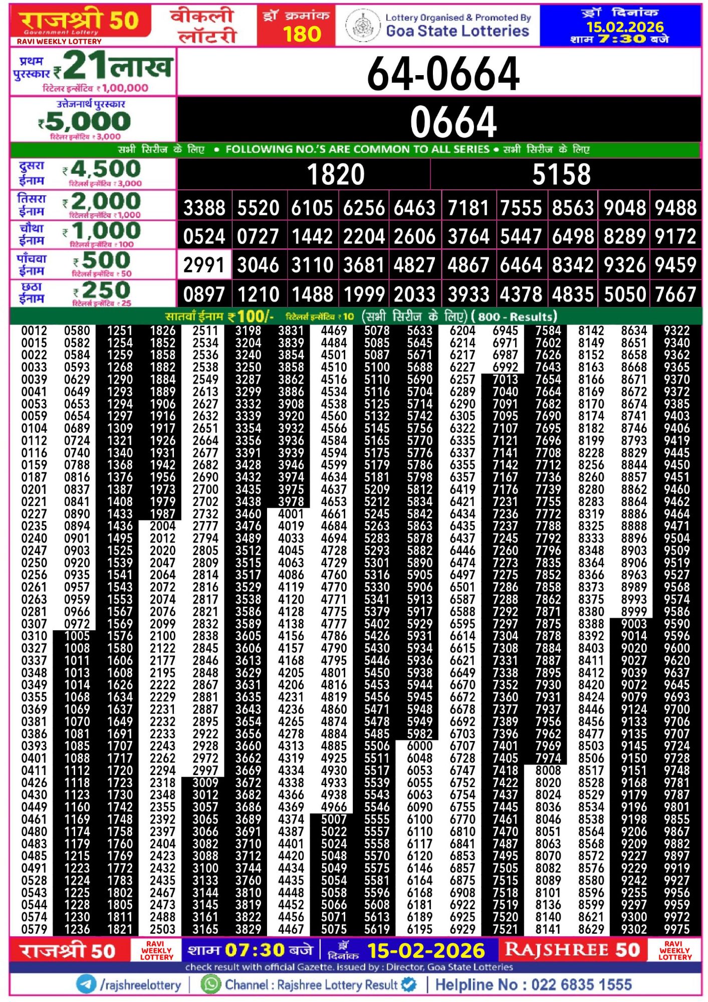 RAJSHREE NIGHT RAVI Weekly Lottery Result 15-02-2026RAJSHREE 50 RAVI Weekly Lottery Result 15-02-2026RAJSHREE SUNDAY Weekly Lottery Result 15-02-2026Dear Magic Weekly Lottery Result 8:00 PM 15-02-2026Golden Star 7PM Result 15-02-2026Dear Empire Weekly Lottery Result 6:00 PM 15-02-2026RAJSHREE 10 EVENING RAVI Weekly Lottery Result 15-02-2026Punjab State Dear Ranger Weekly Lottery Result 5:00 PM 15-02-2026Labh Laxmi Power Sunday lottery result 4pm 15-02-2026RAJSHREE SUNFLOWER Weekly Lottery Result 15-02-2026Kerala Lottery Samrudhi Result 3PM 15-02-2026RAJSHREE RAVI Weekly Lottery Result 15-02-2026Dear Wish Weekly Lottery Result 1:00 PM 15-02-2026