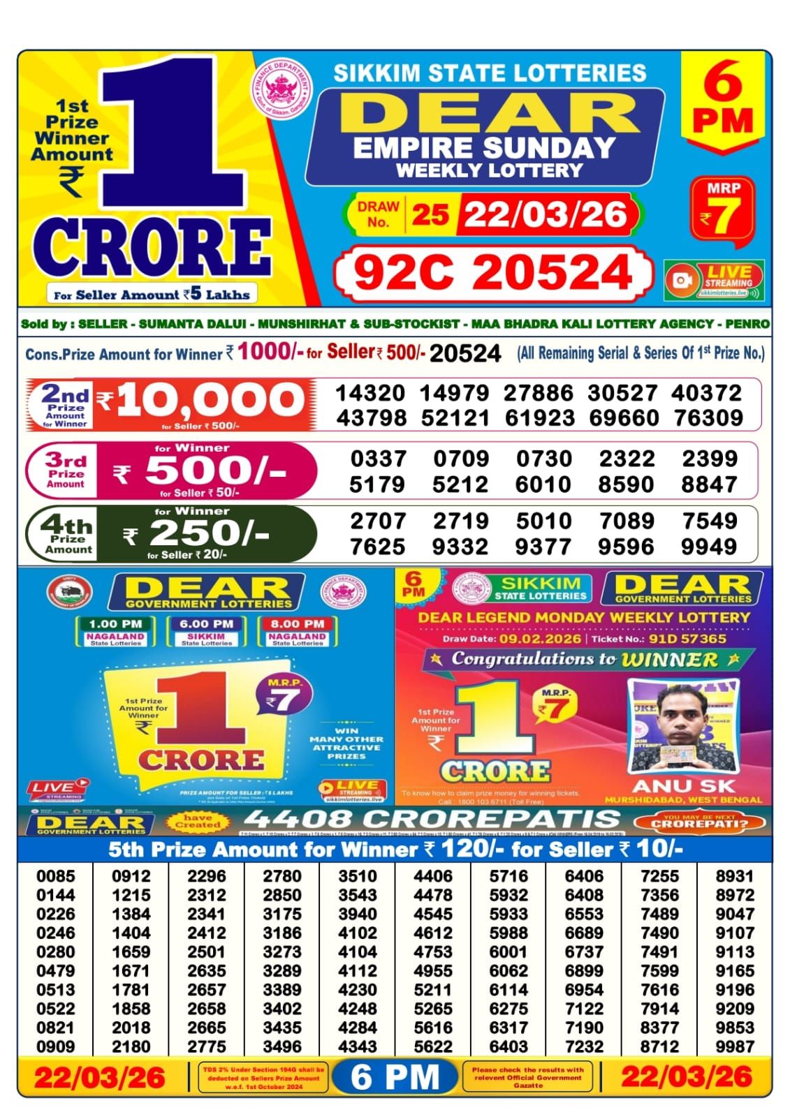 Dear Empire Weekly Lottery Result 6:00 PM 22-03-2026