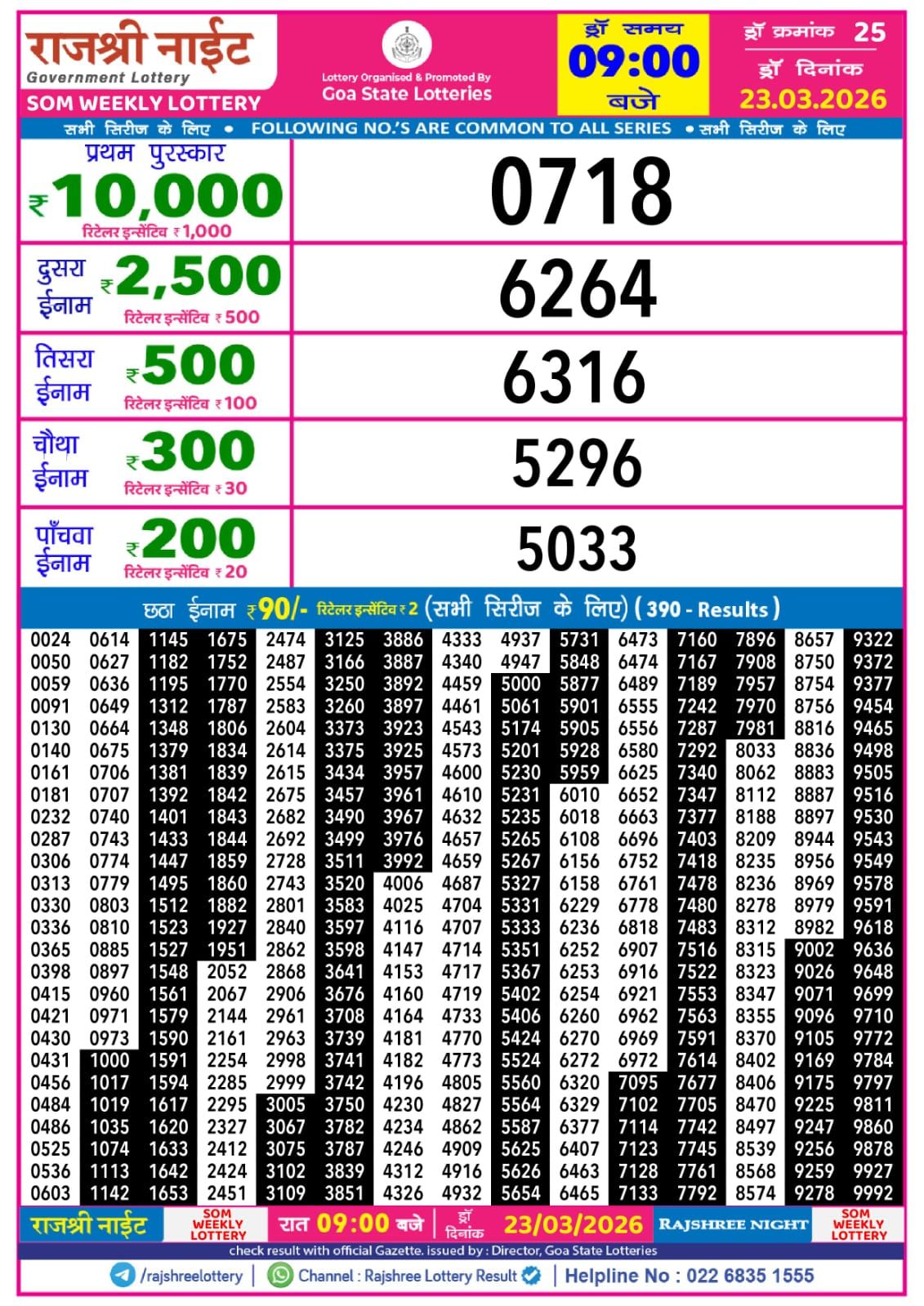 RAJSHREE NIGHT SOM Weekly Lottery Result 23-03-2026Golden Star 8:30PM Result 23-03-2026RAJSHREE 50 SOM Weekly Lottery Result 23-03-2026RAJSHREE MONDAY Weekly Lottery Result 23-03-2026Dear Clover Weekly Lottery Result 8:00 PM 23-03-2026Dear Legend Weekly Lottery Result 6:00 PM 23-03-2026RAJSHREE 10 EVENING SOM Weekly Lottery Result 23-03-2026Punjab State Dear Beast Weekly Lottery Result 5:00 PM 23-03-2026Labh Laxmi Bliss Monday lottery result 4pm 23-03-2026RAJSHREE MARIGOLD Weekly Lottery Result 23-03-2026Kerala Lottery Bhagyathara Result 3PM 23-03-2026RAJSHREE SOM Weekly Lottery Result 23-03-2026Dear Rise Weekly Lottery Result 1:00 PM 23-03-2026