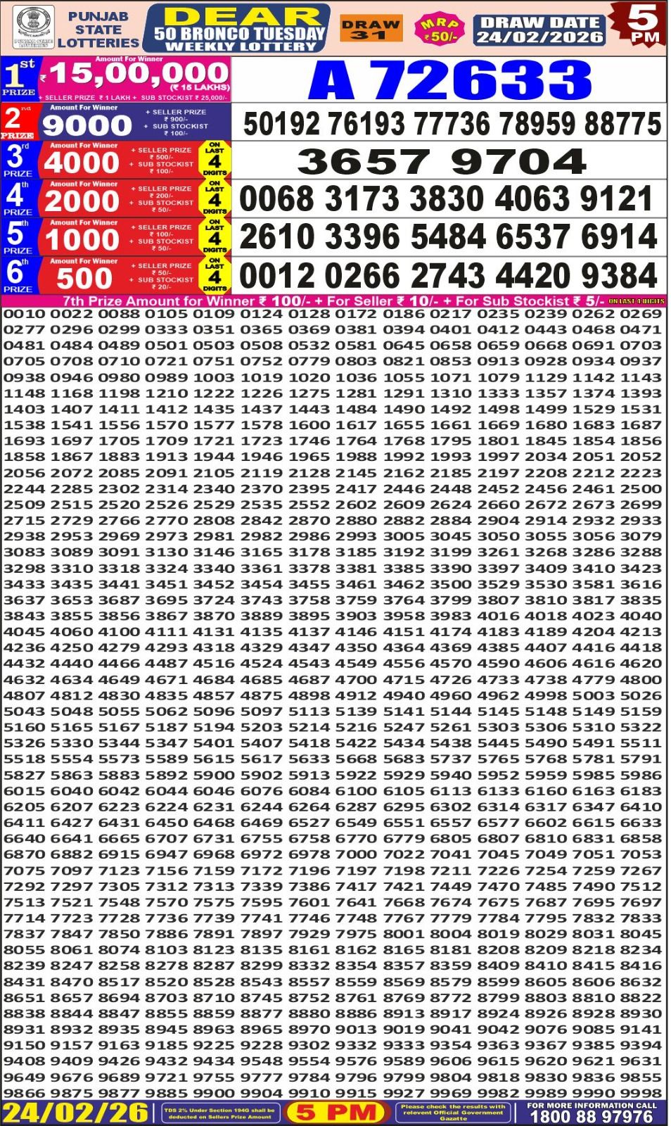 Punjab State Dear Bronco Weekly Lottery Result 5:00 PM 24-02-2026