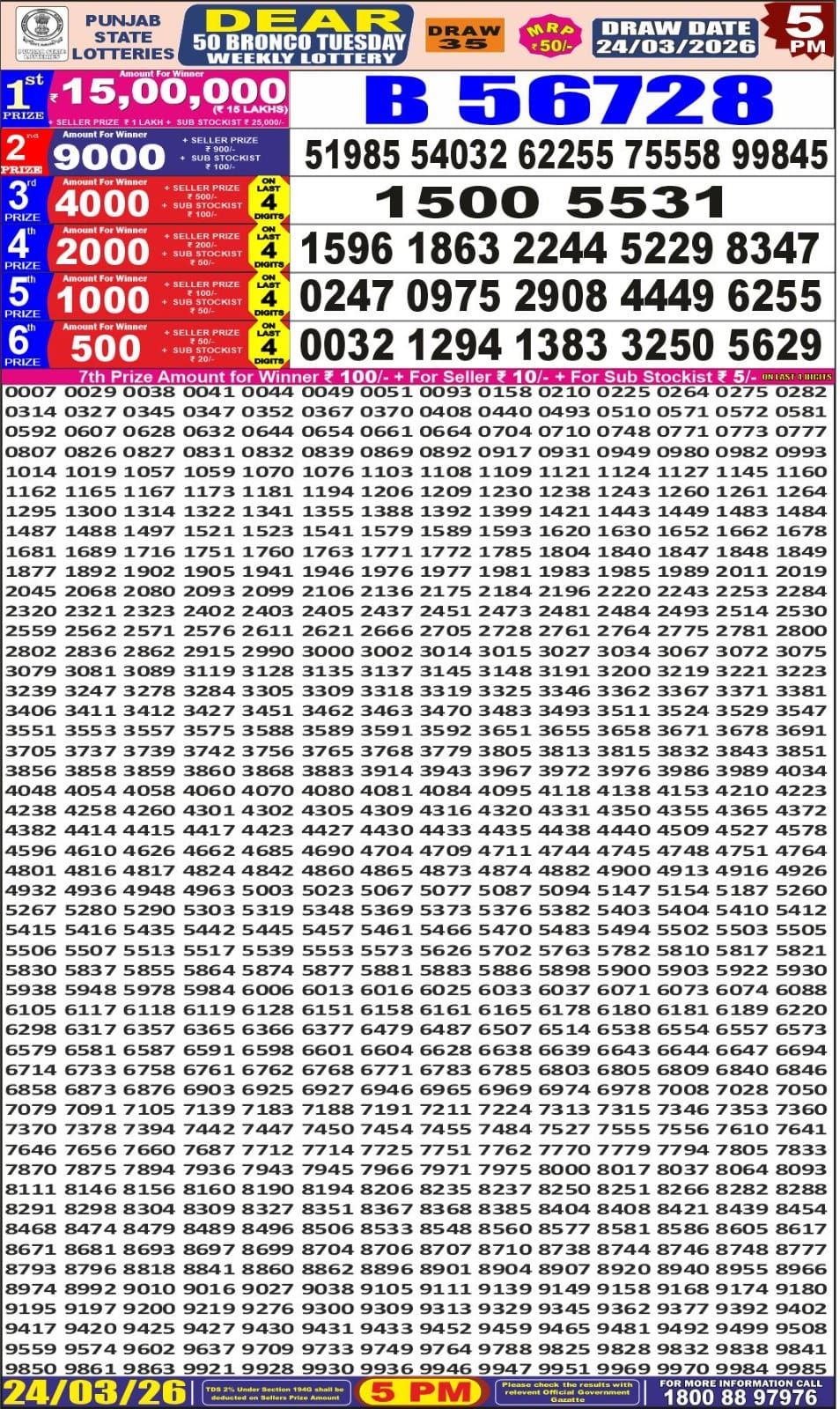 Punjab State Dear Bronco Weekly Lottery Result 5:00 PM 24-03-2026