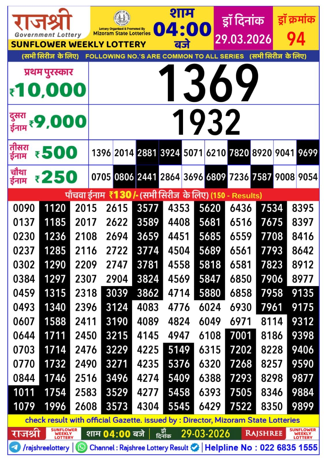 RAJSHREE SUNFLOWER Weekly Lottery Result 29-03-2026