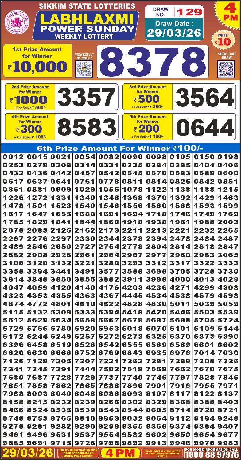Labh Laxmi Power Sunday lottery result 4pm 29-03-2026
