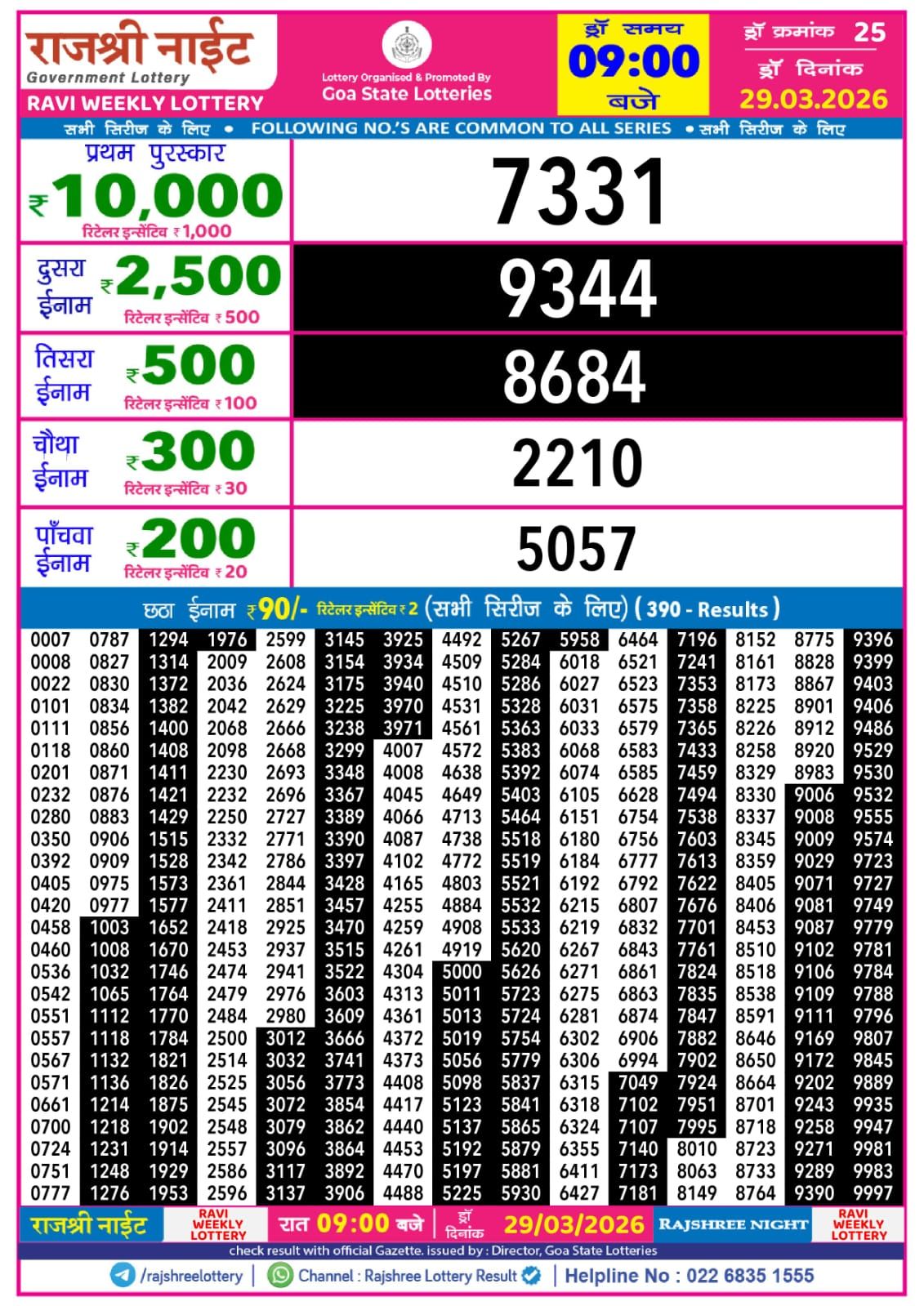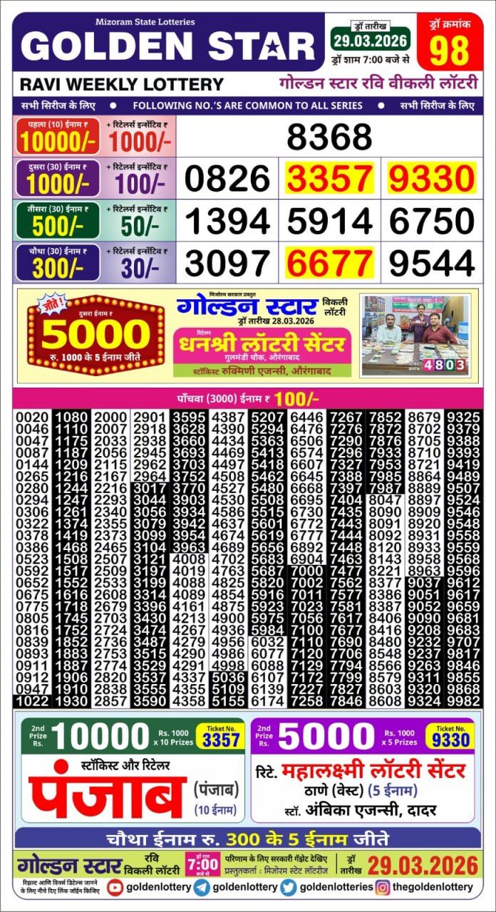 RAJSHREE NIGHT RAVI Weekly Lottery Result 29-03-2026RAJSHREE 50 RAVI Weekly Lottery Result 29-03-2026RAJSHREE SUNDAY Weekly Lottery Result 29-03-2026Dear Magic Weekly Lottery Result 8:00 PM 29-03-2026Golden Star 7PM Result 29-03-2026Dear Empire Weekly Lottery Result 6:00 PM 29-03-2026RAJSHREE 10 EVENING RAVI Weekly Lottery Result 29-03-2026Punjab State Dear Ranger Weekly Lottery Result 5:00 PM 29-03-2026Labh Laxmi Power Sunday lottery result 4pm 29-03-2026RAJSHREE SUNFLOWER Weekly Lottery Result 29-03-2026Kerala Lottery Samrudhi Result 3PM 29-03-2026RAJSHREE RAVI Weekly Lottery Result 29-03-2026Dear Wish Weekly Lottery Result 1:00 PM 29-03-2026